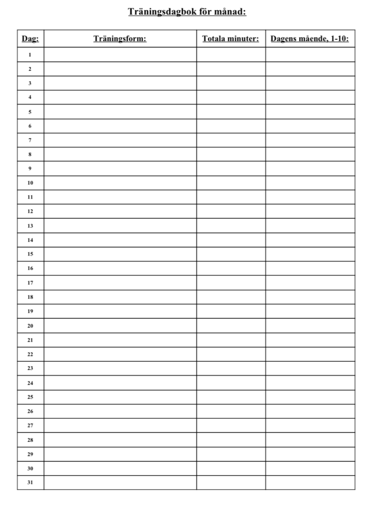 Ladda ner vår gratis träningsdagbok mall för att enkelt hålla koll på dina träningspass, framsteg och mål. Perfekt för alla träningsnivåer och hjälper dig att nå dina fitnessmål effektivt.