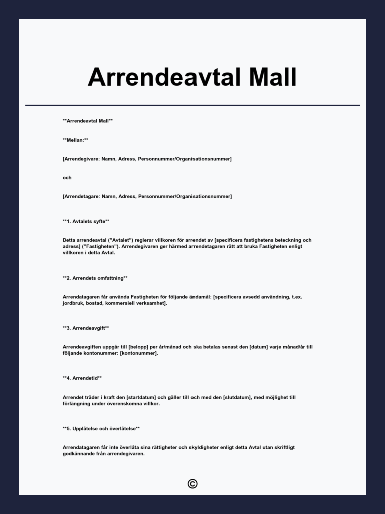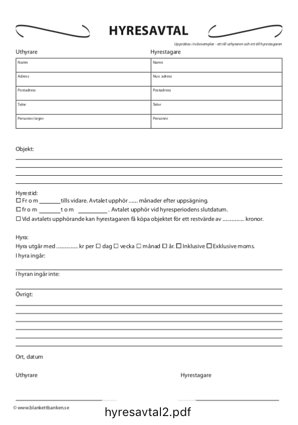 Ladda ner vår gratis hyreskontrakt mall för andrahandsuthyrning på svenska. Enkelt och effektivt verktyg för hyresgäster och hyresvärdar. Säkerställ en trygg uthyrningsprocess idag.