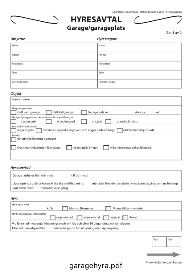 Ladda ner gratis hyreskontrakt mall för garage. Enkla och anpassningsbara blanketter som underlättar uthyrningen. Perfekt för både hyresvärdar och hyresgäster som söker smidiga och tydliga avtalslösningar.