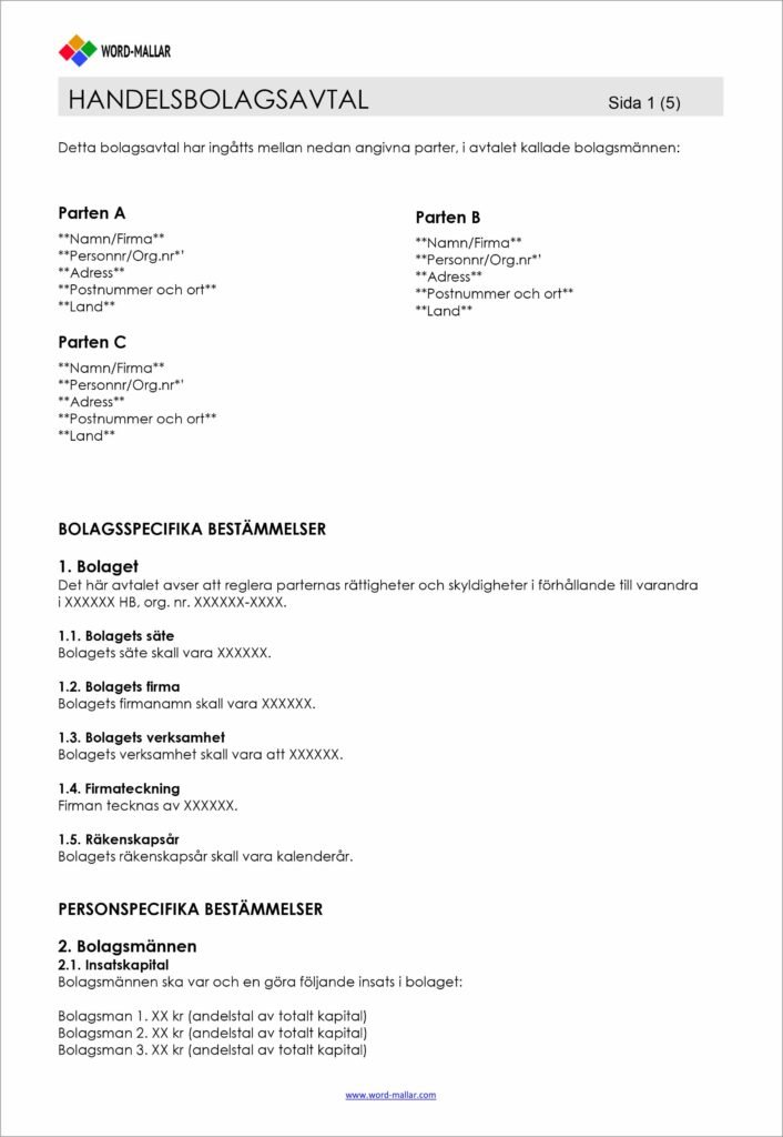 Ladda ner gratis mall för bolagsavtal handelsbolag i PDF