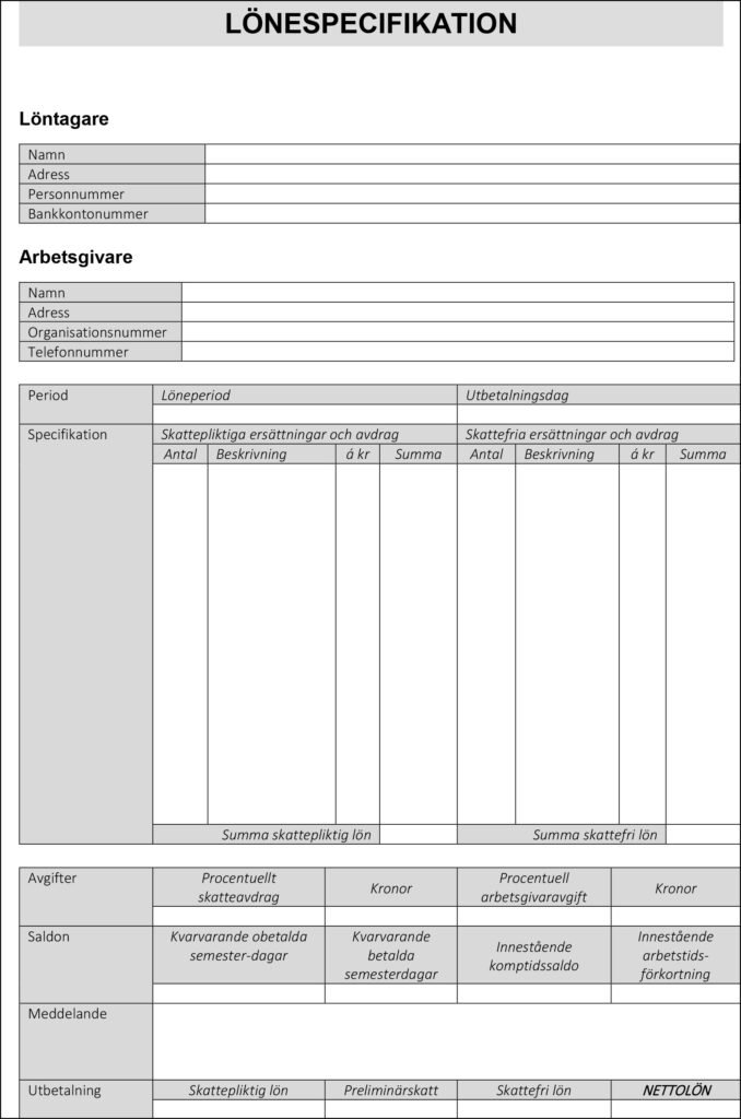 Ladda ner en gratis lönespecifikation mall i Excel-format. En praktisk och användarvänlig mall för att skapa tydliga och professionella lönespecifikationer snabbt och enkelt.